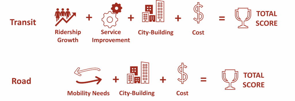 The Council-approved Transit and Road Project Prioritization Framework was used to score and rank projects for implementation. Prioritization for transit projects assessed ridership growth and service improvement. Prioritization for road projects assessed mobility needs like access to development and congestion reduction. For both transit and road projects, city-building considerations were assessed, including impacts to equity and natural systems, access to major destinations, economic development, and GHG emissions. Capital cost estimates were also assessed.