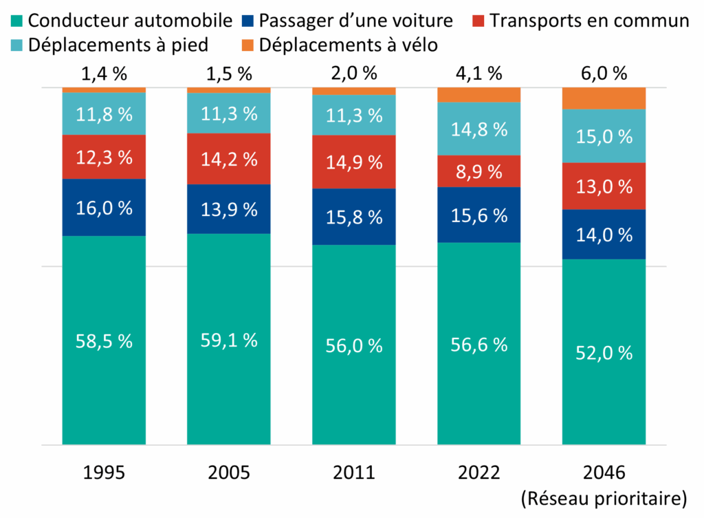 Évolution temporelle des parts modales journalières (1995–2046)