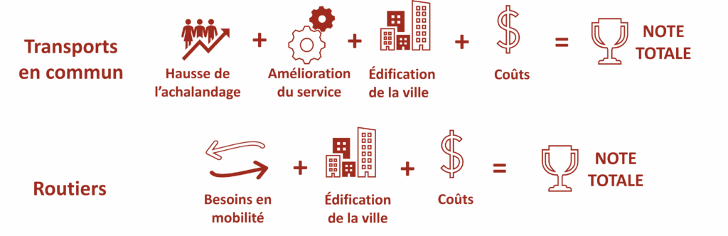 Le cadre de priorisation des projets de transports en commun et routiers approuvé par le Conseil a été utilisé pour noter et classer les projets devant être mis en œuvre. La priorisation des projets de transports en commun a permis d’évaluer la croissance de l’achalandage et l’amélioration des services. La priorisation des projets routiers a permis d’évaluer les besoins en mobilité comme l’accès aux complexes d’aménagement et la réduction de la congestion. Pour les projets de transports en commun comme pour les projets routiers, les considérations d’aménagement de la ville ont été évaluées, notamment les répercussions sur l’équité et sur les systèmes naturels, l’accès aux principales destinations, le développement économique et les émissions de GES. Les estimations des dépenses en immobilisations ont également été évaluées.